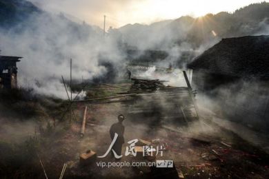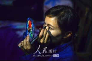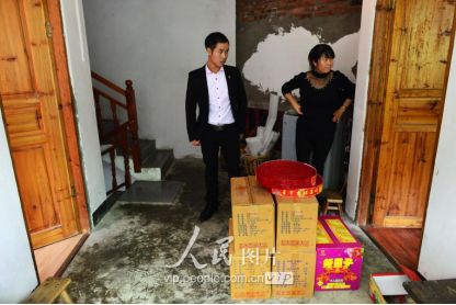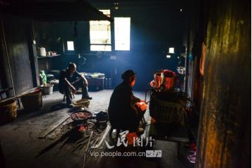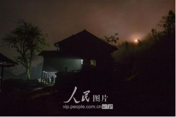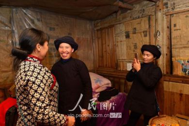 一般要到快過(guò)春節(jié)的時(shí)候,男方家才專門請(qǐng)人去接女方來(lái)洗糯米、打糍粑,新娘方能在夫家住上一夜;在來(lái)年農(nóng)忙時(shí)節(jié),又接女方來(lái)幫忙,夜里仍不能在男方家留宿,幫完忙當(dāng)晚即回去,只有待到女方有身孕后,新娘才到夫家長(zhǎng)住。圖為11月16日夜,新娘潘芝銀家為準(zhǔn)備婚禮,燈火徹夜長(zhǎng)明。