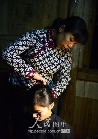11月16日夜,新娘的親人在婚禮前為新娘潘芝銀盤頭發(fā)。