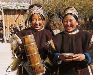在工布地區(qū),不管是遠(yuǎn)方的來客,還是常來常往的朋友,一踏進(jìn)主人的新家,主人首先端出的是香噴噴的酥油茶。如果是尊貴的客人,還要被請到上座。招待來客時,主人會敬上酥油茶和青稞酒,尤其是青稞酒,主人要兩手棒著,恭敬地送到客人手上,客人喝一口,主人添一次,連續(xù)三次??腿俗詈笠豢跉獍驯械木坪韧辏@就是通常所說的三口一杯。如果客人推辭,主人還要獻(xiàn)上優(yōu)美動聽的酒歌,以此來表達(dá)主人的熱情和對客人的尊敬,直到客人把杯中的酒喝完為上。手捧酒杯,主人依次要給所有的來客敬上一遍。杯杯醇酒,盛滿了工布人的情和意。那情景,常令在場的人感動不已。