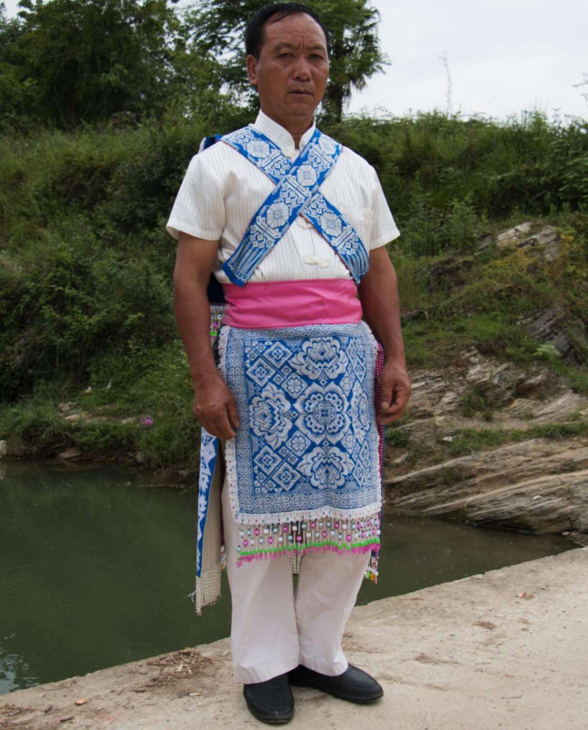 谷立村男子服飾相對于苗族女子服飾則顯得較為簡樸,男子上身主要穿著白色打底的對襟衣,身后背有背牌,背牌底色為藍(lán)色,上繡有花朵圖案作為裝飾。下身主要以藍(lán)色打底的圍裙為主,身前圍裙,上面布滿刺繡圖案。身后的圍裙則為一條條獨(dú)立的絲帶,絲帶上同樣布滿花紋刺繡圖案,在其底部還串有珠簾作為裝飾。