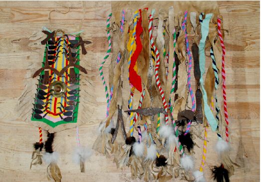 腰裙下擺的前后配戴著50個(gè)銅鈴,以此代表眾多神靈的福音。腰裙上還系著一對(duì)熊神和一對(duì)狼神偶體,因?yàn)槎鯗乜巳苏J(rèn)為熊是人類的祖先,人們不能輕易傷害獵取,如果一旦打死熊,也要對(duì)熊骨進(jìn)行風(fēng)葬。而狼據(jù)說(shuō)是神靈的兒子。這些又都可見薩滿信仰又與鄂溫克人在原始社會(huì)條件下的自然崇拜、祖先崇拜有著非常緊密的淵源關(guān)系。