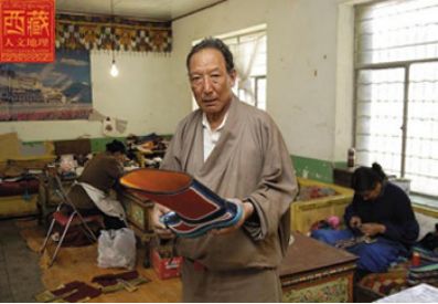 坐在工作臺(tái)上的赤列塔青,身材高大,穿一身合體的淺色藏裝,前擺上沾著幾星鼻煙,長(zhǎng)期用針的手指有些變形。翻開(kāi)他的履歷發(fā)現(xiàn),赤列塔青可以說(shuō)是拉薩少有的制靴世家,他的父親邊巴頓珠在舊社會(huì)是個(gè)給人支差的貧苦鞋匠,靠給有錢(qián)人修鞋、做鞋為生。今年68歲的赤列塔青性格沉穩(wěn)、做事穩(wěn)健,他12歲當(dāng)學(xué)徒工,做鞋做了56年,如果再加上父輩的修鞋歷史,時(shí)間更長(zhǎng)。在今天的拉薩有這樣經(jīng)歷的人算是屈指可數(shù)了。赤列塔青從小就在父親和師傅身邊打下手,逐漸掌握這個(gè)足以養(yǎng)家糊口的一技之長(zhǎng),終于成長(zhǎng)為一個(gè)勤奮而多才的手工藝人,開(kāi)始了穩(wěn)坐一隅的匠人生涯。