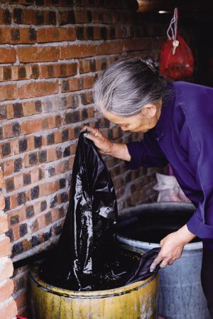 黃奶奶帶我去看她染布的地方,屋頂一間小小的屋子里擺了三個大缸,還沒走近就聞到濃烈的藍靛發(fā)酵所產(chǎn)生的獨特氣味。染缸用厚厚的布蓋著,如同黃奶奶的秘密寶箱,要掀開才能看到里面深色的液體?!敖裉觳怀?,下次染布給你看?!彼戳丝匆后w表面,也沒多說,似乎染缸有它自己的節(jié)奏。