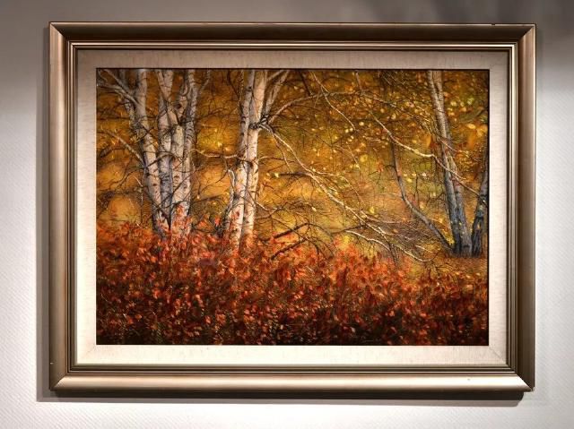 本作品表現(xiàn)的是深秋時(shí)節(jié)森林金黃,白樺樹落葉點(diǎn)點(diǎn)、露出白色枝干的景象。整體繡面用色豐富多彩,炫而不俗;針法靈活多變,層次鮮明,仿佛置身其間,給人以美的享受。