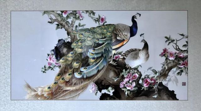 原作是畫家張玉明的工筆畫作品。一對孔雀棲息于爛漫盛開的山茶花間顧盼回首,相映成趣。整體繡面繡工精細(xì)、絲光迥動(dòng),將蘇繡精、細(xì)、雅、潔的特點(diǎn)表現(xiàn)得淋漓盡致。