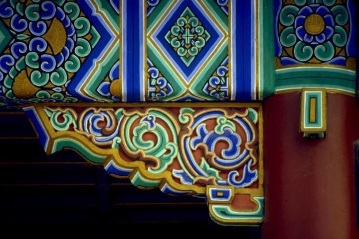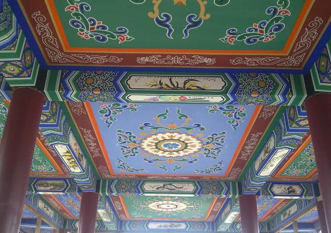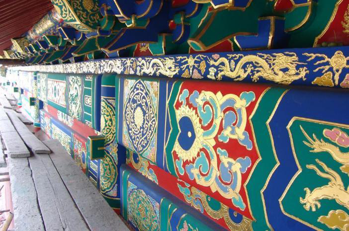 彩畫著色是一項關(guān)鍵的工序,不能有半點差錯。工匠們?yōu)椴煌伾O(shè)定了代號,一米色、二淡青、三香色、四硝紅、五粉紫、六洋綠、七佛青、八石黃、九紫色、十黑煙、十一紅等。將代號直接寫在地仗上,然后根據(jù)色號將各種色料對號入座,涂刷著色一、二遍,待干后再刷一遍光油罩光,以起保護(hù)作用。彩畫所用色料一般均為各色成品油漆。