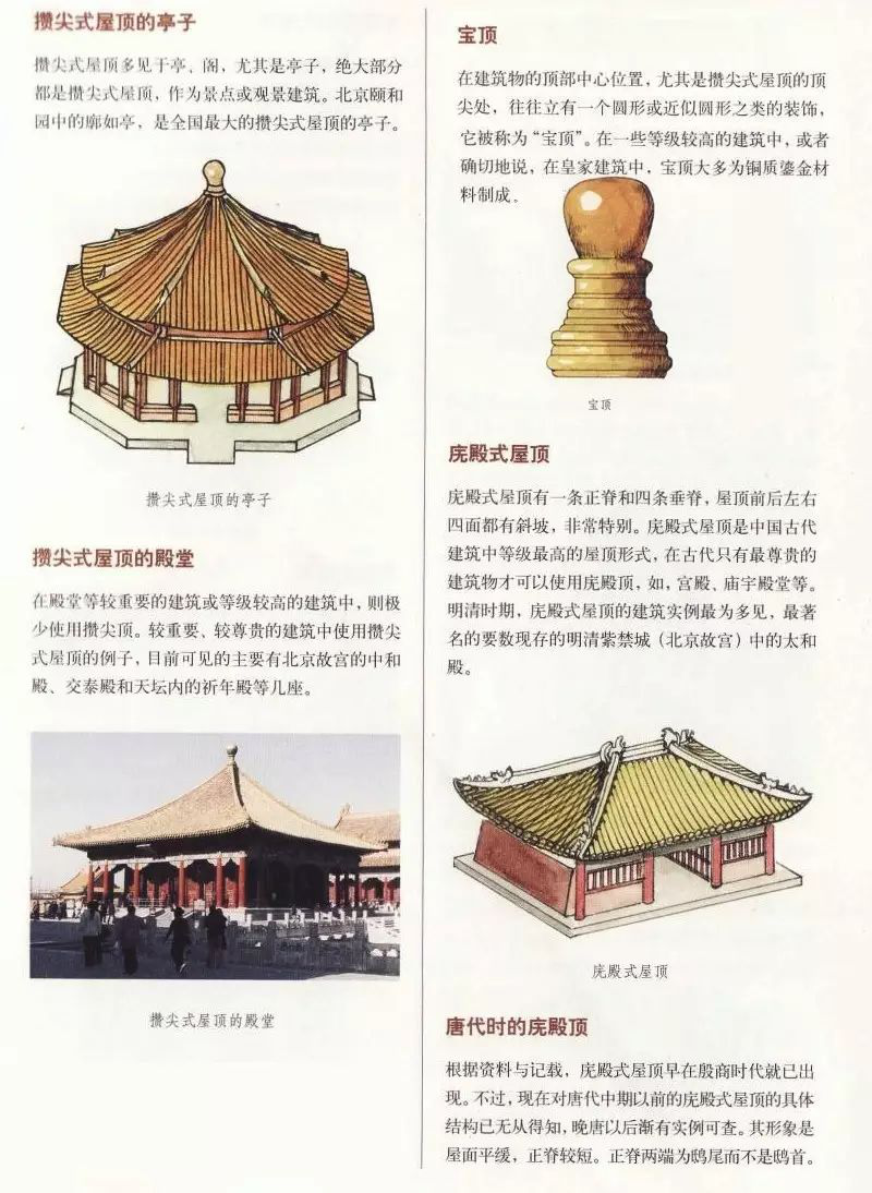 無(wú)正脊,只有垂脊,只應(yīng)用于面積不大的樓、閣、亭、塔等,平面多為正多邊形及圓形,頂部有寶頂。根據(jù)脊數(shù)多少,分三角攢尖頂、四角攢尖頂、六角攢尖頂、八角攢尖頂。此外,還有圓角攢尖頂,也就是無(wú)垂脊。攢尖頂多作為景點(diǎn)或景觀建筑,如頤和園的郭如亭、麗江黑龍?zhí)豆珗@等。在殿堂等較重要的建筑或等級(jí)較高的建筑中,極少使用攢尖頂,而故宮的中和殿、交泰殿和天壇內(nèi)的祈年殿等卻使用的是攢尖頂。攢尖頂有單檐、重檐之分。