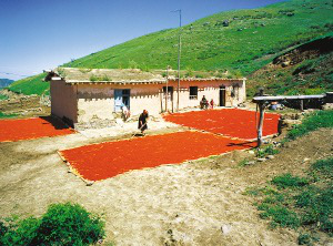 土房的室內(nèi)除有的搭火炕外,其它的裝飾和木房的一樣。到了采收紅花的季節(jié),鮮紅欲滴的紅花曬滿了院子,形成獨(dú)特的風(fēng)景。不論哪個(gè)房間,都可作為臥室,也用于待客,廚房和儲(chǔ)藏室單建,有的還單建馕坑。