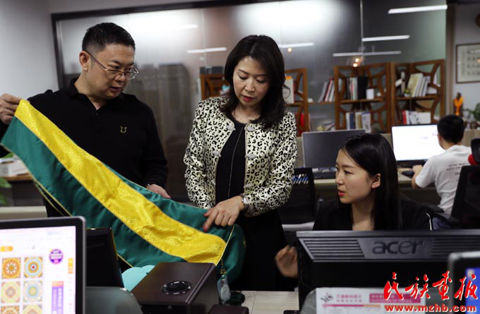 孔麗(中)是來(lái)自云南德宏的景頗族,她的公司致力于將少數(shù)民族優(yōu)秀文化與商業(yè)相結(jié)合,這是她在與公司員工商議產(chǎn)品設(shè)計(jì)方案(和勇 攝影)
