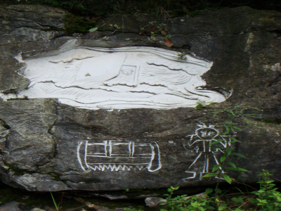 筆者在該村所見的具有“文化生態(tài)村”建設(shè)痕跡,除了村口巨石上鐫刻的文字外,還修建了一條貫通項(xiàng)目組專家們規(guī)劃的“文化生態(tài)展示區(qū)”的石板路,并在作為展示重要文化景觀的地方豎立了介紹或解釋性的文字標(biāo)牌。如,村口、山神廟前、摔跤場等都立有介紹的招牌。讓筆者疑惑和認(rèn)為不應(yīng)該“改造”的是在村民們的祖靈洞巖壁上的“藝術(shù)石刻”(見圖)。從筆者與村民的訪談和項(xiàng)目組的總結(jié)報告資料中,可以把文化生態(tài)村建設(shè)試點(diǎn)項(xiàng)目組在月湖開展的文化保護(hù)工作歸結(jié)為如下幾個方面: