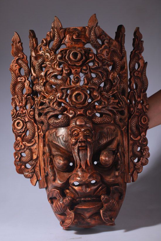 描述:程咬金,字義貞,原名咬金,后更名知節(jié)。驍勇善戰(zhàn),歷史上是唐朝開國名將,以“三板斧”的形象在民間廣為流傳。在地戲唱本《薛仁貴征東》和《薛丁山征西》中,均有程咬金的出場。根據(jù)《隋唐演義》的內(nèi)容,程咬金雖然頭腦簡單,卻是個有福之人,被認為是福將,所以在地戲面具的刻畫上,在嘴角兩側(cè)雕刻上一堆蝙蝠,以取“?!钡闹C音。又因為程咬金在唐代算是長壽之人,故爾額頭上刻一壽星,帶給人福壽雙全的吉祥含義。