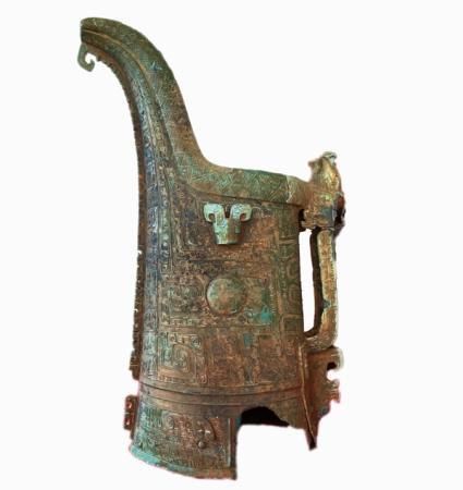 出土?xí)r,銅觥側(cè)置平放,銅壺倒置于銅觥內(nèi)。銅觥重13.45千克,器身呈扁圓形??脊艑<曳Q,該銅觥器形獨(dú)特,如突出眼睛的變形獸面紋、“C”形扉棱、羊角騰空設(shè)計(jì)的平嘴犧首等,與以尊、罍為代表的殷墟時(shí)期南方特征青銅器相一致。