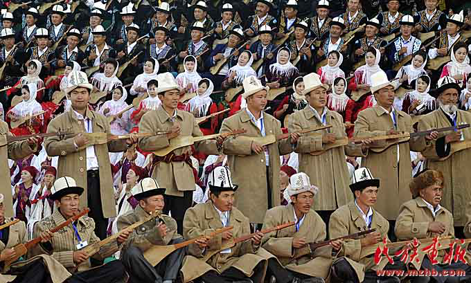 庫(kù)姆孜彈唱展演,由圖可見庫(kù)姆孜在柯爾克孜族中的普及程度(約提克爾·尼加提 攝影)