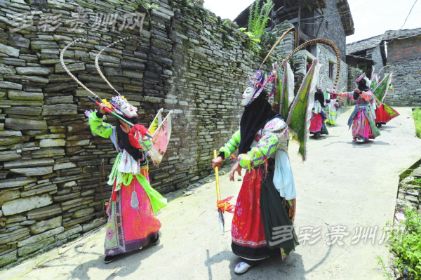 安順地戲的顯著特點是演出者頭蒙青巾,腰圍戰(zhàn)裙,戴假面于額前,手執(zhí)戈矛刀戟之屬,隨口而唱,應(yīng)聲而舞。