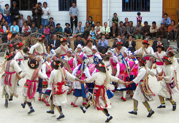 (1)反映風(fēng)俗禮儀的舞蹈。主要有婚禮舞?;槎Y舞主要流行于云南怒江、保山、德宏等地區(qū)傈僳族中,是在舉行訂婚、結(jié)婚的喜日儀式跳的一種群體舞。跳時(shí)男女分開,面對(duì)面排列成兩排,以一定的步伐和有力的跺腳、踏步為拍,有時(shí)并列前進(jìn),或交叉進(jìn)行,有時(shí)一進(jìn)一退,互相呼應(yīng)。其舞步重在腳下功夫,動(dòng)作簡單、重復(fù),但一旦起舞,情動(dòng)于中,熱烈非凡。
