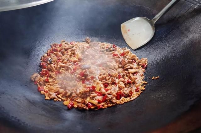 立即將剁成小塊的雞肉放入鍋中不停翻炒。