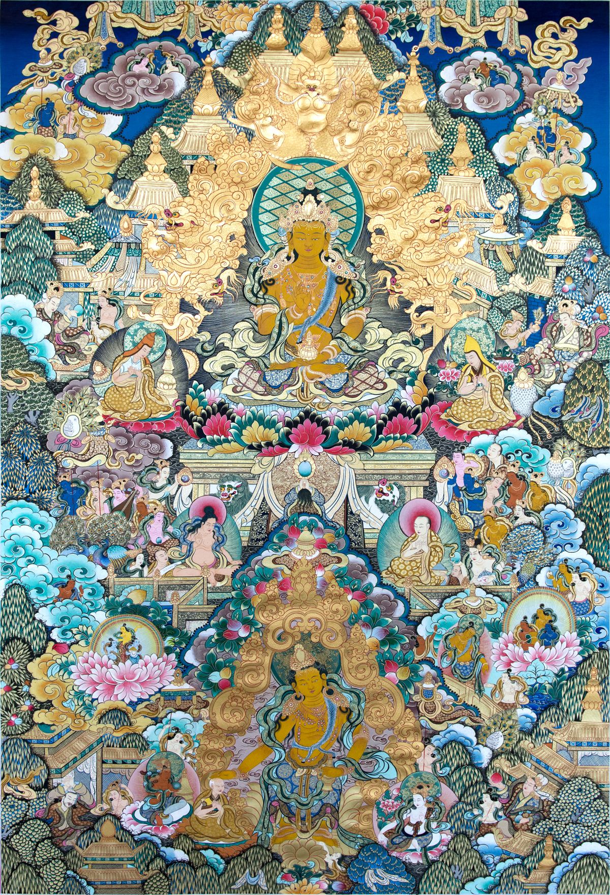 主尊未來世界彌勒佛菩薩,左邊描繪了噶當(dāng)派創(chuàng)世者阿底峽尊者與他的弟子。右邊描繪了格魯派的創(chuàng)世者宗喀巴大師與兩大弟子克主杰和迦側(cè)杰,中部周圍供奉者八大隨喜菩薩文殊菩薩、普賢菩薩、觀世音菩薩、金剛手菩薩、虛空藏菩薩、地藏菩薩、彌勒菩薩、除蓋障菩薩,畫面四角供奉為彌勒佛未來世界的迎接與弘揚(yáng)佛法的情景。畫面上空描繪了仙女四處飛揚(yáng),空中漂浮著吉祥的圖案與神秘的瑞相等等。整體畫完之后選擇一個殊勝吉祥的日子點(diǎn)所有諸佛的五官,發(fā)髻、手勢、法器、畫面后部畫家要親自寫聲、語、法的字號。作品完工之后寺院里進(jìn)行眾多活佛和高僧大德的加持與開光儀式。