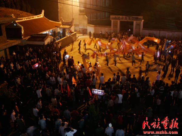 晚上十點半,在農村,這已經可以算作深夜了。但承啟樓門前依然聚滿了人,其他地區(qū)舞龍隊的不斷光臨讓這里也是鞭炮聲不斷。雖然累,從高南返回承啟樓的舞龍隊隊員們依然興奮不已,他們在樓前的馬路上攔住過往的其他村舞龍隊,要求共舞一場。