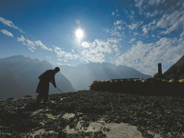 夕陽西下,陽光從山的后面投射出光束,一只老鷹在山谷上空順著風(fēng)勢(shì)盤旋。楊慶平又開始將晾曬的煙葉慢慢收攏?!叭死狭?,我是不會(huì)離開寨子了,也離不開了?!睏顟c平說他會(huì)一直守護(hù)著祖屋,守護(hù)著寨子。