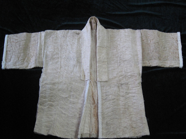 據(jù)了解,制作樹皮布的樹種有厚皮樹、黃九樹、構(gòu)樹(學名為楮樹)、見血封喉(又稱箭毒木)等,以見血封喉的樹皮加工出來的樹皮布質(zhì)地最好。制作樹皮布的步驟是:第一步:扒樹皮。首先制作能夠敲打和剝離樹皮的工具、選取樹干筆直、不長節(jié)、木質(zhì)較為堅硬的樹木,砍成長40厘米、直徑為5厘米的兩根木棍。一根用刀把一頭削細,用于敲打樹皮;另一跟把一頭削成木楔狀,用于剝離樹皮。根據(jù)需要制作的物件大小,扯一根藤,量一下樹干上方和下方之間的長度,再用鉤刀在樹的上、下方各砍一道記號,然后用木棍在記號的范圍內(nèi)敲打樹皮,使其蓬松,與樹干分離。在敲打的過程中,有經(jīng)驗者通過聆聽木棍敲打在樹干上的聲音,就可以辨別出哪里還沒有敲打夠,于是繼續(xù)敲打該處,直到感覺整個樹皮已經(jīng)與樹干完全分離,這時才用鉤刀在上、下方作記號的地方把樹皮砍一圈,中間用刀豎著劃一道口子,再用特制的木楔棍一點一點地撬樹皮,將樹皮進行片狀剝離。第二步:休整。將剝離下來的整塊樹皮壓平,除掉表皮,削掉節(jié)疤,拍打樹皮纖維,使其松動。第三步:漂洗。在水中進行搓洗拍打,脫去樹膠,保留軟狀的樹皮纖維。第五步:曬干。將脫膠后洗凈(含有大量水分)的樹皮纖維晾干。第六步:拍打。把曬干的樹皮纖維拍打整平,使樹皮纖維分布均勻,呈片狀,于是制成樹皮布。最后將樹皮布裁剪、縫綴??p制樹皮衣的工序是:先把軟狀的單層樹皮布折成雙層,按人體結(jié)構(gòu)的大小裁剪出領(lǐng)口、袖口,再用自制的麻線縫綴成衣物。