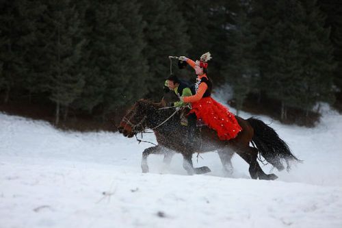 在傳統(tǒng)的竟技比賽場上,最激動人心的還是“姑娘追”它往往是全場比賽的壓軸戲?!肮媚镒贰?據(jù)說是由上古“追姑娘”的風(fēng)習(xí)演變而來,至今既是哈薩克人最喜愛的娛樂項目,又是小伙子找對象談情說愛的好機(jī)會。