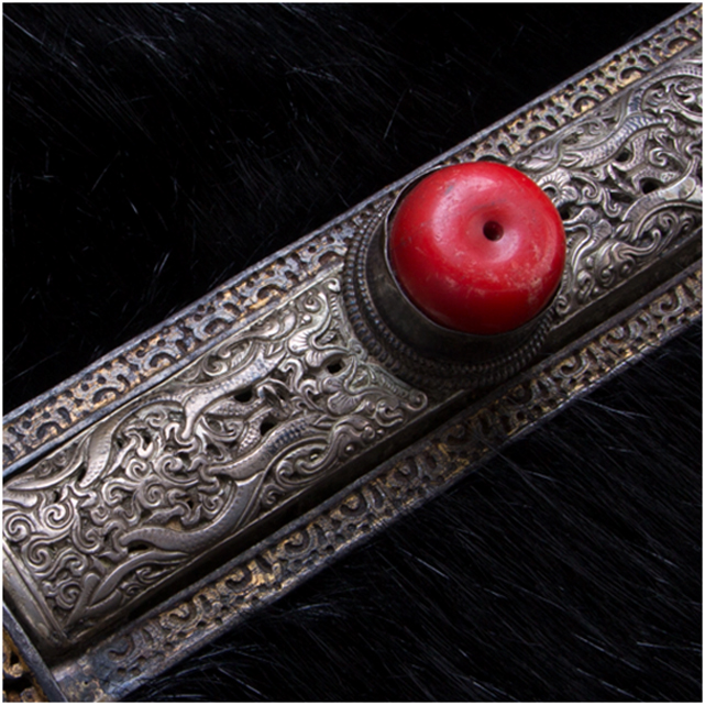 康區(qū)人性格粗獷豪放,刀對(duì)于他們來(lái)說(shuō),主要是戰(zhàn)斗的武器,他們愛刀勝過(guò)愛牛羊,一把好刀就是一筆財(cái)富,其形象也會(huì)因之而無(wú)形中高大起來(lái)。正因?yàn)槿绱?,他們不僅對(duì)刀本身有較高的要求,對(duì)其作為襯托武士氣概的刀的外在形制也有特殊的喜好。刀鞘材料一般使用黃、白銅或純銀,鑲珠嵌寶,正面雕龍畫鳳,背面線刻卷草,佩在身上,起到了美觀和威懾的雙重作用。
