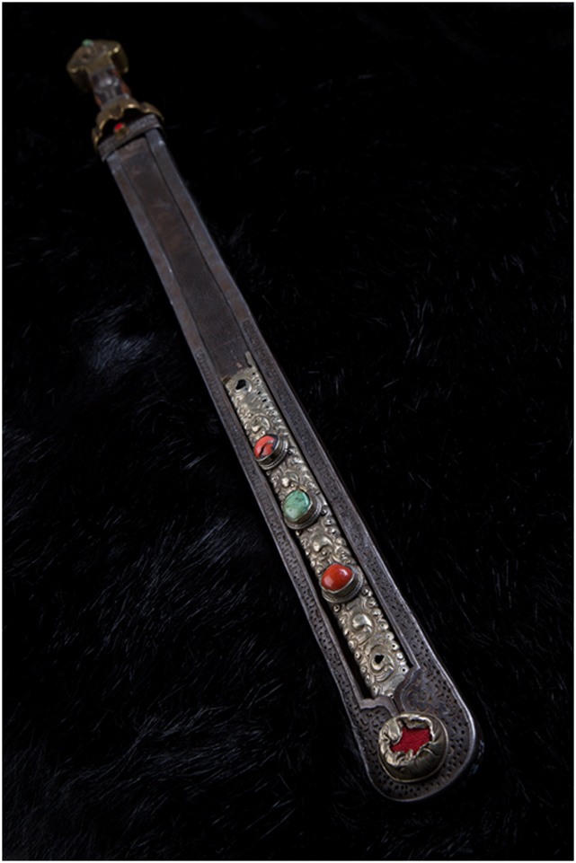 安多地區(qū)主要以放牧為主,牧民的刀主要用于宰殺和吃肉,有嚴(yán)格的男用女用之分,男式刀長(zhǎng)度在一尺以上,女式刀在一乍左右,刀鞘的底部和刀柄的末端上翹,呈船形。安多人喜歡珠寶,頭飾、胸飾、腰飾無(wú)不光燦耀人,這些飾物同樣被用在刀上,刀鞘和刀柄錨金錯(cuò)銀,鑲嵌著珊瑚和綠松石,像精美的藝術(shù)品。