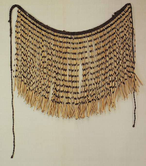 博嘎爾婦女穿一種叫“基都”的短上衣。用野麻織成的土布縫制,其樣式為無領、短袖、對襟。下部穿用羊毛織成的粗呢緊身筒裙,稱作“結(jié)邦”。小腿部扎裹腿,叫“涅蘇木”。條件好的人家外面還會罩一件稱為“階納布”的披肩。希蒙部落的婦女穿當?shù)孛藁棾傻陌咨蛩{色的寬大對襟短上衣。下身穿筒裙,裙子下擺較寬,上面織有黃紅色或黃黑色的簡單圖案(圖為民國時期的珞巴族草裙,中央民族大學民族博物館館藏)。