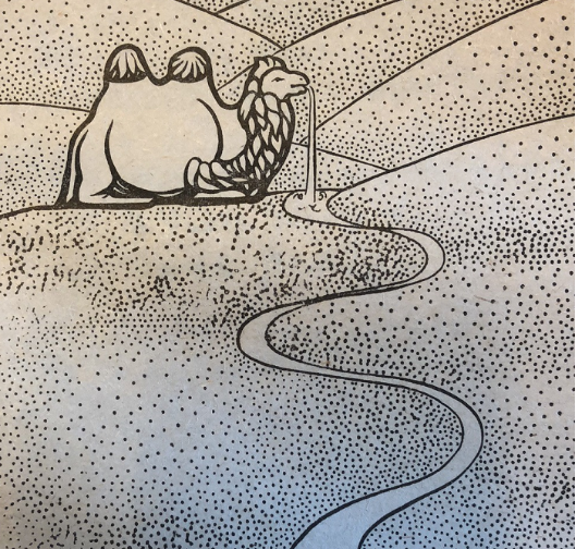 高興之際,大家想起了馱經(jīng)馱水土的駱駝;但是人們四下里一看,白駱駝不見了。真是,為了找水喝竟把勞苦功高的駱駝丟失了!大家找呀,找呀,找了一夜還沒找到,天亮?xí)r,又回到燒茶的地方,然后順?biāo)?,繼續(xù)尋找。走不多遠(yuǎn),發(fā)現(xiàn)駱駝在前面靜靜地臥著,人們高興極了,有一個(gè)人三步兩步跑上去拉駱駝,可是駱駝一動(dòng)也不動(dòng)。眾人上前詳細(xì)一看,白駱駝已變成了石頭。那石駱駝在水里臥著,一股清水從它的嘴里噴出來,散發(fā)看清香的氣味,流向遠(yuǎn)方。