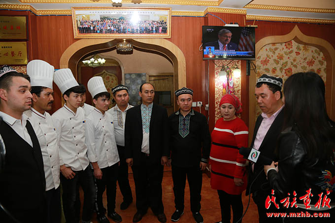 新疆美食城店主阿地力·買買提帶領(lǐng)維吾爾、哈薩克、回族等員工學(xué)習(xí)十九大報告