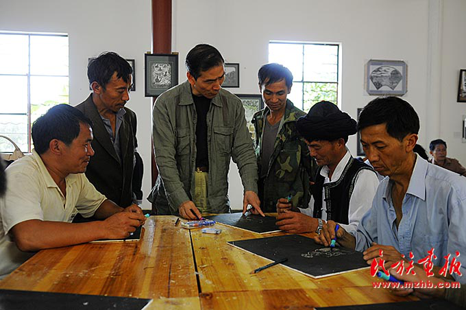 為了提升作品質(zhì)量,阿峨新寨村的版畫創(chuàng)作者邀請專家對其進行藝術(shù)指導(dǎo)