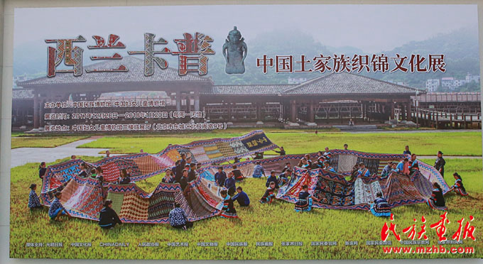 2017年12月20日,“西蘭卡普——中國土家族織錦文化展”在北京中國婦女兒童博物館開展。展覽由中國民族博物館和中國婦女兒童博物館聯(lián)袂主辦,張家界市人民政府駐京辦事處協(xié)辦。展覽開幕前舉行了土家織錦文化小型座談會,與會嘉賓從不同角度暢談了土家織錦的藝術特色。中紀委駐財政部紀檢組原組長、全國婦女手工編織協(xié)會副會長賀邦靖,國家新聞出版廣電總局原黨組成員、副局長宋昌明,中國作家協(xié)會主席團委員、中國少數(shù)民族作家學會常務副會長葉梅,張家界市委常委、宣傳部長郭天保,張家界市副市長尚生龍,國家民委國際交流司原副司長吳金光,中國婦女兒童博物館副館長劉華彬、北京孔廟和國子監(jiān)博物館館長吳志友等人參加了座談會并參觀展覽。