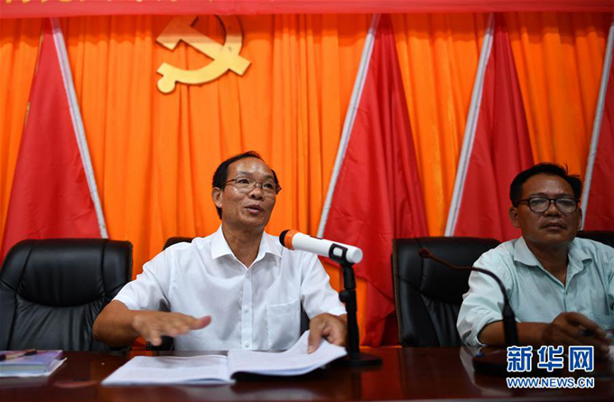 2017年9月28日晚,羊風極(左)在海南省白沙黎族自治縣打安鎮(zhèn)田表村村委會組織黨員進行“兩學一做”學習教育活動