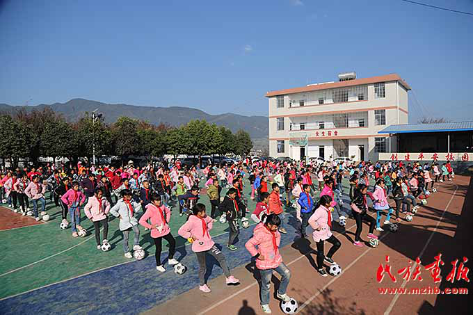 在新村聯(lián)排別墅的最南邊是中村鄉(xiāng)小學(xué),這所學(xué)校是同傈園新村相依而伴建在一起的。上午十點,課間操的鈴聲打破了新村的寧靜。學(xué)生們歡快地沖出教室,每人手捧足球,來到操場。在老師統(tǒng)一的號令下,孩子們跳起了足球課間操。歡快的音樂旋律,伴著運球、帶球等不同的動作,孩子們的天真爛漫得到了充分詮釋。小學(xué)校長張世喜看著學(xué)生們歡樂的表情,高興的表情溢于言表。他說:“孩子們太幸福了?!?6年前,張世喜從楚雄師院畢業(yè)回到了家鄉(xiāng)的中村鄉(xiāng)峨山村委會小學(xué),“場是土巴地,籃球架是用兩棵大樹做成的,教室里的桌椅高矮不一,找不到品相相同的兩張課桌,孩子們的宿舍是兩三個人擠一張床……”回憶起那時情景,張世喜記憶猶新。 “現(xiàn)在好了,住宿生縣財政每月每人都要補貼100元伙食費,孩子們頓頓有肉吃了,還為我們建起了兩棟宿舍樓,268名住宿生每人一張床,再也不用擠著睡了?!睆埵老舱f,在這樣的辦學(xué)條件下,我們工作越來越有激情了。