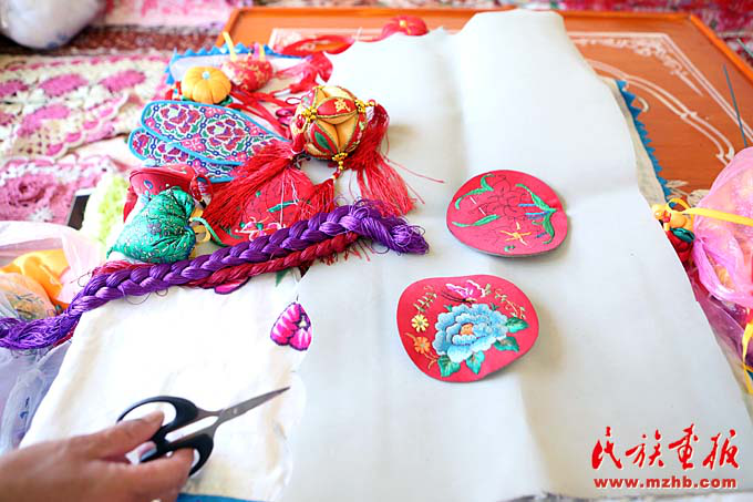 走進(jìn)她的家中,只見(jiàn)不大的房間中擺滿了荷包、繡花鞋墊、枕頭等刺繡品。桌上五顏六色的彩線旁,馬阿英社和兒媳婦正聚精會(huì)神地依著設(shè)計(jì)好的圖案“飛針走線”。