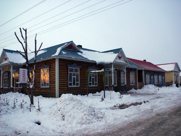 建造木刻楞房一般要墊苔蘚。苔蘚墊在中間,零下30℃到40℃寒冷的情況下,有了苔蘚壓在底下,冬天非常暖和,夏天非常涼快。當(dāng)房屋建造好之后都會及時地在房屋的木料上刷上清油,不但可以保護木料本身的顏色,也可以防止房屋因受潮而變形,更可以起到防止各類昆蟲啃噬建筑木料的作用。俄羅斯族人對于建筑或房屋的色彩極其講究,每種顏色在俄羅斯族人的心目中都會代表不同的寓意。因此,俄羅斯人在房屋蓋好之后都會根據(jù)自己的喜好在房屋上刷帶有吉祥寓意的色彩。