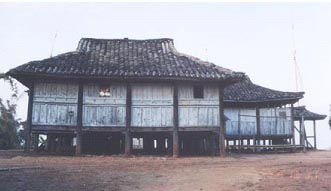 鎮(zhèn)康地區(qū)若干小家庭同住一幢房子,房內(nèi)中間有寬敞的走道,兩旁為各小家庭住室,間壁而居,各有火塘,所以竹樓較大,有的占地近四百平方米。這種干欄式長方形大屋居住形式源于過去德昂族地區(qū)仍保留父系大家族社會組織,也就是說有血緣關(guān)系的后代都共同居住在一所大房子內(nèi),房屋的大小要依據(jù)家庭成員多少而定。雖然隨著社會的發(fā)展和大家庭生活方式的改變而瓦解消失,但在解放初期還能看到它們的遺址或縮小了的原型。