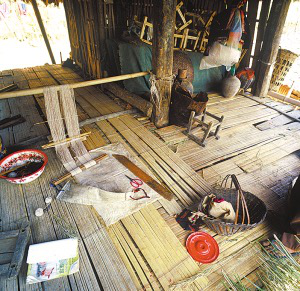 樓上住人、煮飯、貯藏糧食,樓下圈養(yǎng)牲畜。以簡易板梯上下,有小廊道。室內(nèi)順梁開前后兩道門,中間的通道將屋內(nèi)分成兩部分。右側(cè)為客房,設火塘,供佛像;左側(cè)為家人臥房,以竹篾隨意分隔,無門,只擋一布簾,通風透光。正門一邊搭曬臺,用來曬糧、曬衣服和洗漱。住房一側(cè)多建有附房,用以堆柴、舂米、放置生產(chǎn)工具和雜物。