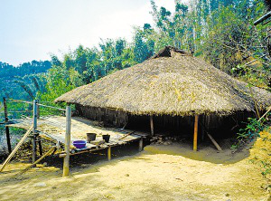 云南省潞西市三臺山鄉(xiāng)的德昂族居住分散,村寨很小,大都建在高半山上,山路行車困難。傳統(tǒng)住房為正方形干欄式竹木建筑,房屋兩層,為木柱結(jié)構(gòu)框架,竹篾編片圍墻,粗竹劈壓成自然的竹片做樓板,屋頂苫草排,當?shù)厮追Q“草帽頂房?!?/p>