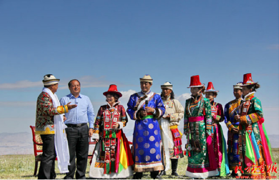 CCTV7《鄉(xiāng)約》欄目錄制現(xiàn)場。向全國觀眾介紹肅南縣及裕固族文化。央金攝 引自民族畫報