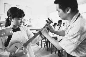 圖為一位音樂教師在指導(dǎo)學(xué)生調(diào)試侗族琵琶。 王炳真攝影報道