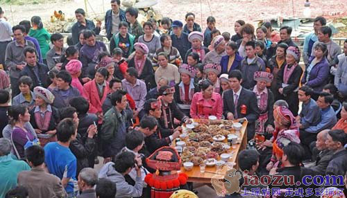 接著就是用美味佳肴盛情款待“親家客”。午餐和晚餐時(shí),新郎方的客人(叫“老房客”)派出代表(男陪女,女陪男)用大碗酒和大塊肉陪“親家客”飲酒吃肉,大有不把“親家客”灌醉不休之雄心。晚宴過(guò)后,親朋好友們都會(huì)圍著篝火,開(kāi)始對(duì)歌,內(nèi)容大多是對(duì)新人的夸獎(jiǎng)和祝福,如““十五的月亮明又亮, 小伙子就像月亮一個(gè)樣,黑夜里有顆星, 它像姑娘一樣靚,瑤家姑娘作新娘, 美麗得像蝴蝶,新郎也不遜色喲, 如胸前的銀牌一樣閃光輝。”等等。