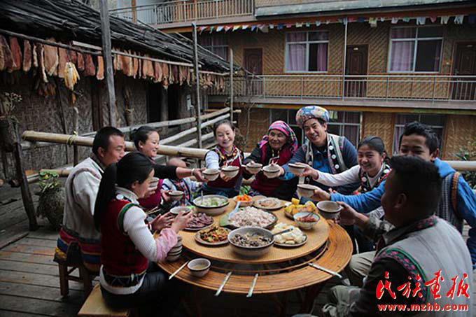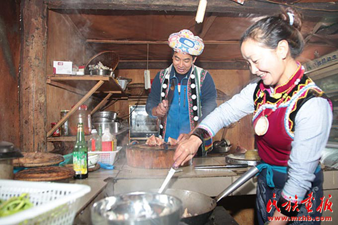 早上,老姆登村73歲的怒族老人斯普早早起來招呼兒子郁伍林、兒媳魯春花:“春節(jié)快放假了,客棧的生意會忙得不可開交,趁著現(xiàn)在客人不多,家里人先吃一頓團(tuán)圓飯吧。”斯普老伴早年過世,7個兒女中老五郁伍林在身邊照顧她?!斑^去在春節(jié)才能吃上一頓好飯菜,也要準(zhǔn)備很長時間,現(xiàn)在每天都有好吃的,天天在過年,多虧了黨的好政策?!闭f起今天的幸福生活,生在舊社會的斯普感慨萬千。