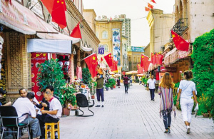 喀什古城從2010年至2015年,經(jīng)過5年整修改建,有效保護和傳承了老城區(qū)歷史文化風貌。家家戶戶在門前懸掛國旗,表達對祖國的美好祝福。