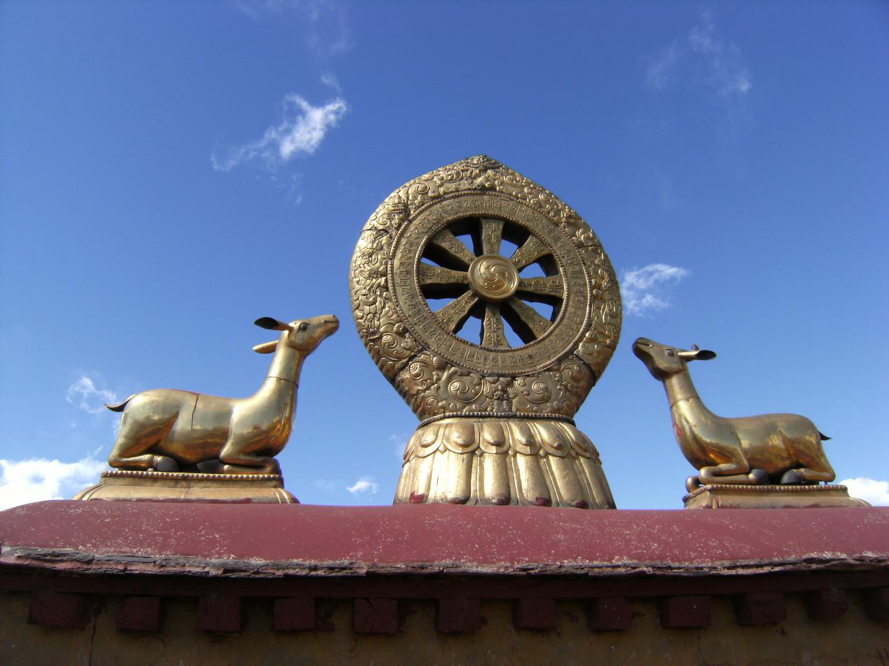 全寺坐東朝西,建筑具唐代風(fēng)格,有高四層的銅質(zhì)鎦金樓閣五座、殿堂數(shù)十間。正殿供奉文成公主從長(zhǎng)安帶往的釋迦牟尼像,像前擺放十二盞金燈。各殿有松贊干布、文成公主、墀尊公主的塑像及佛像、祖師塑像,還有壁畫(huà)眾多。珍藏有七世紀(jì)以來(lái)的歷代文物。
