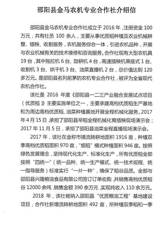 在農機專業(yè)合作社的幫助下,當?shù)剞r業(yè)生產(chǎn)過程的機械化程度非常高。邵陽縣金馬農機專業(yè)合作社,位于邵陽縣金稱市鎮(zhèn)石馬村,主要提供組織農業(yè)機械耕整、插秧、收割服務,大大提高了當?shù)氐姆N植和生產(chǎn)效率。