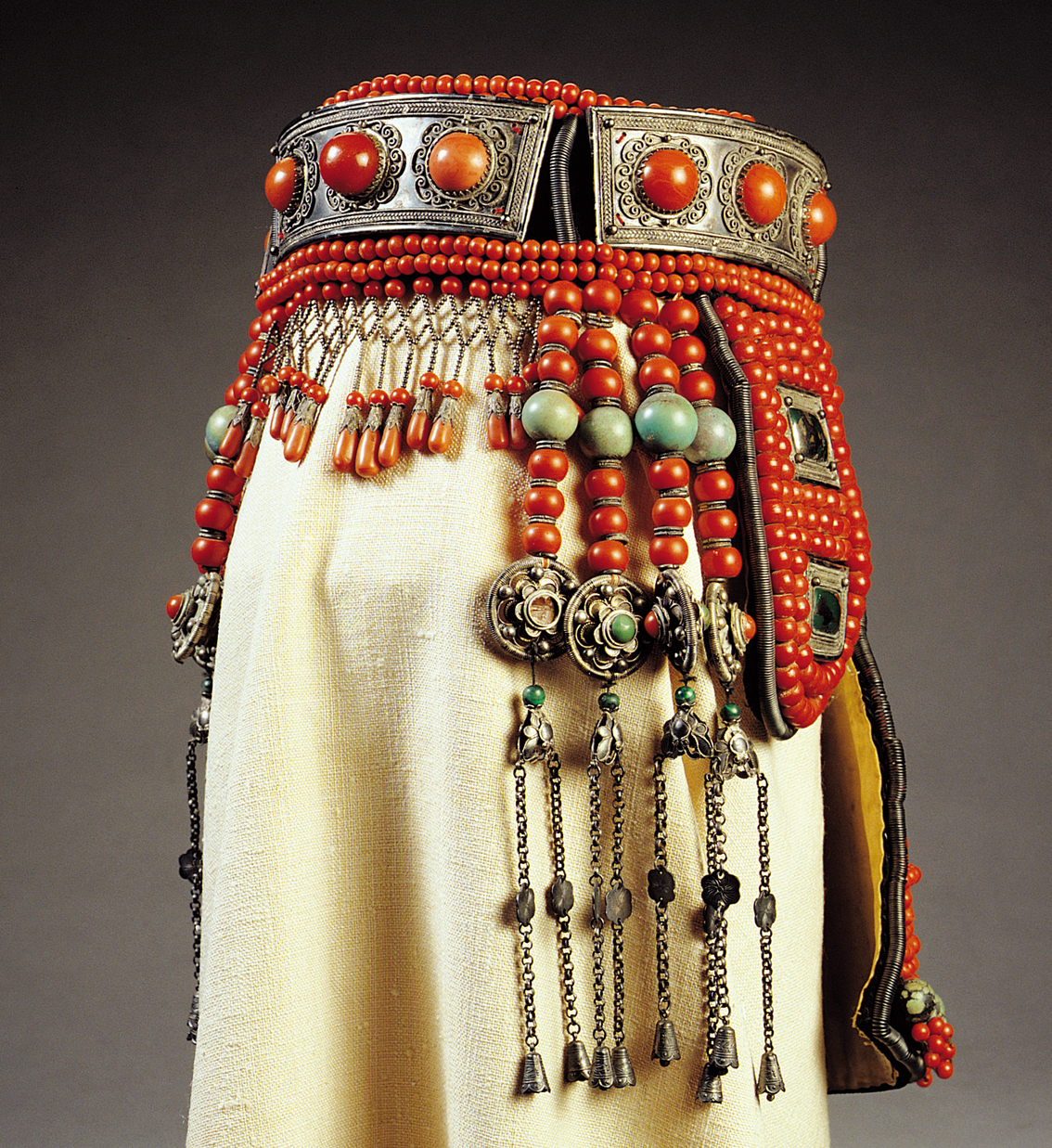 草原上,婦女們平時一般多罩頭巾。頭巾大約丈余長,顏色多種多樣。質料有布、麻、綢、絹等。姑娘們喜歡將頭巾纏在頭上,然后在右側挽一個小結,把頭巾的穗頭垂下來。已婚婦女們則用頭巾包住頭頂后,纏一圈,不留穗頭。在莊重的場合還要戴上繡有丹鳳朝陽、二龍戲珠等花紋圖案的帽子。帽頂上有紅色穗子和閃光明亮的帽頂寶石。傳說這種習俗始于成吉思汗時期。當初成吉思汗統(tǒng)一蒙古各部落之后,下令每個人都要罩頭巾,以表示頭顱上飄有旌旗之角,希冀民族強大之精神常在。從結婚、告別姑娘生活的那天起,婦女們便開始佩戴雍容華貴的盛裝首飾。而蒙古族的盛裝頭飾,以鄂爾多斯地區(qū)最為典型。這種頭飾漢譯為“頭戴”,主要由“連垂”和“發(fā)套”兩部分組成。不僅制作工藝精湛,而且多用數(shù)百顆珊瑚、數(shù)十條銀鏈、珍珠串和許多銀環(huán)、銀片以及瑪瑙、玉石等穿綴而成。裝扮起來可謂珠簾垂面、琳瑯滿目。一副頭戴一般都重達三四斤,有的可達十余斤。據(jù)說一副高檔頭戴,過去往往要用幾群好馬或數(shù)百峰好駝才能換取。