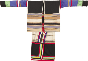 北京服裝學(xué)院民族服飾博物館藏基諾族砍刀布鑲彩條女套裝。李昕/圖