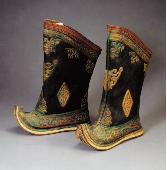 蒙古人愛穿靴子,蒙古靴分布靴和皮靴兩種。布靴多用厚布或帆布制成,穿起來柔軟、輕便。皮靴多用牛皮、馬皮或驢皮制成,結(jié)實耐用,防水抗寒性能好。其式樣大體分靴尖上卷、半卷和平底不卷的三種,分別適宜在沙漠、干旱草原和濕潤草原上行走。蒙古靴做工精細(xì)考究,靴幫、靴靿上多繡制或剪貼有精美的花紋圖案。