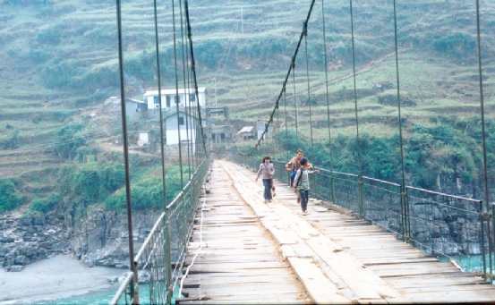 怒江大峽谷及其兩岸的碧羅雪山和高黎貢山層巒疊嶂,危巖聳立,懸崖陡峭。谷中水流湍急,洶涌澎湃。自古以來,這里的交通就十分不便,正所謂“巖羊無路走,猴子也發(fā)愁”。整個怒江只有幾處水勢稍緩的渡口可以用木船擺渡,除此而外,其它地方既無法架橋,又不能涉渡。兩岸的怒族人民只有依靠溜索這種古老的渡江工具往來飛渡,保持著彼此間的交往與聯(lián)系。